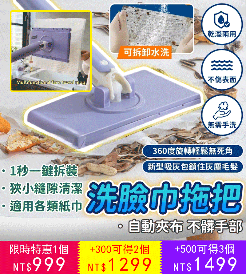 5分鐘前【2024設計獎得獎上新】免手洗懒人伸縮拖把,新升級設計,不在擔心拖把不好弄,新升級長度設計,同時不沾手放人工擰拖把,使打掃變得簡單 - 【今日限定 買三送三 6把+ 拖布*6包 】-NT$1499